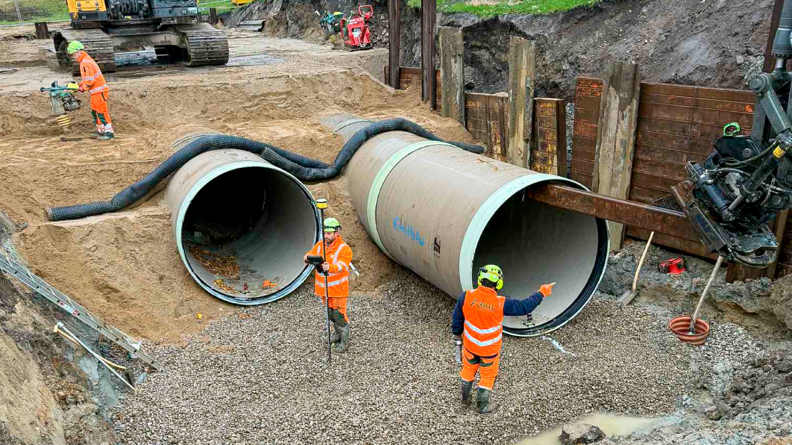 Sjakket er nu færdige med etableringen af de to Ø2000-rør, og arbejder i øjeblikket på at tilslutte de nye rør til det eksisterende ledningsnet. Det er Ø800 glasfiberrør, der forbinder de nye rørbassiner til det allerede etablerede rørsystem.