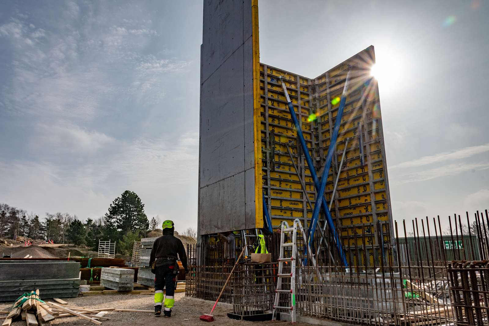 De mange Dywidag-stænger sørger for at holde sammen på støbeformene, selvom trykket bliver stort.