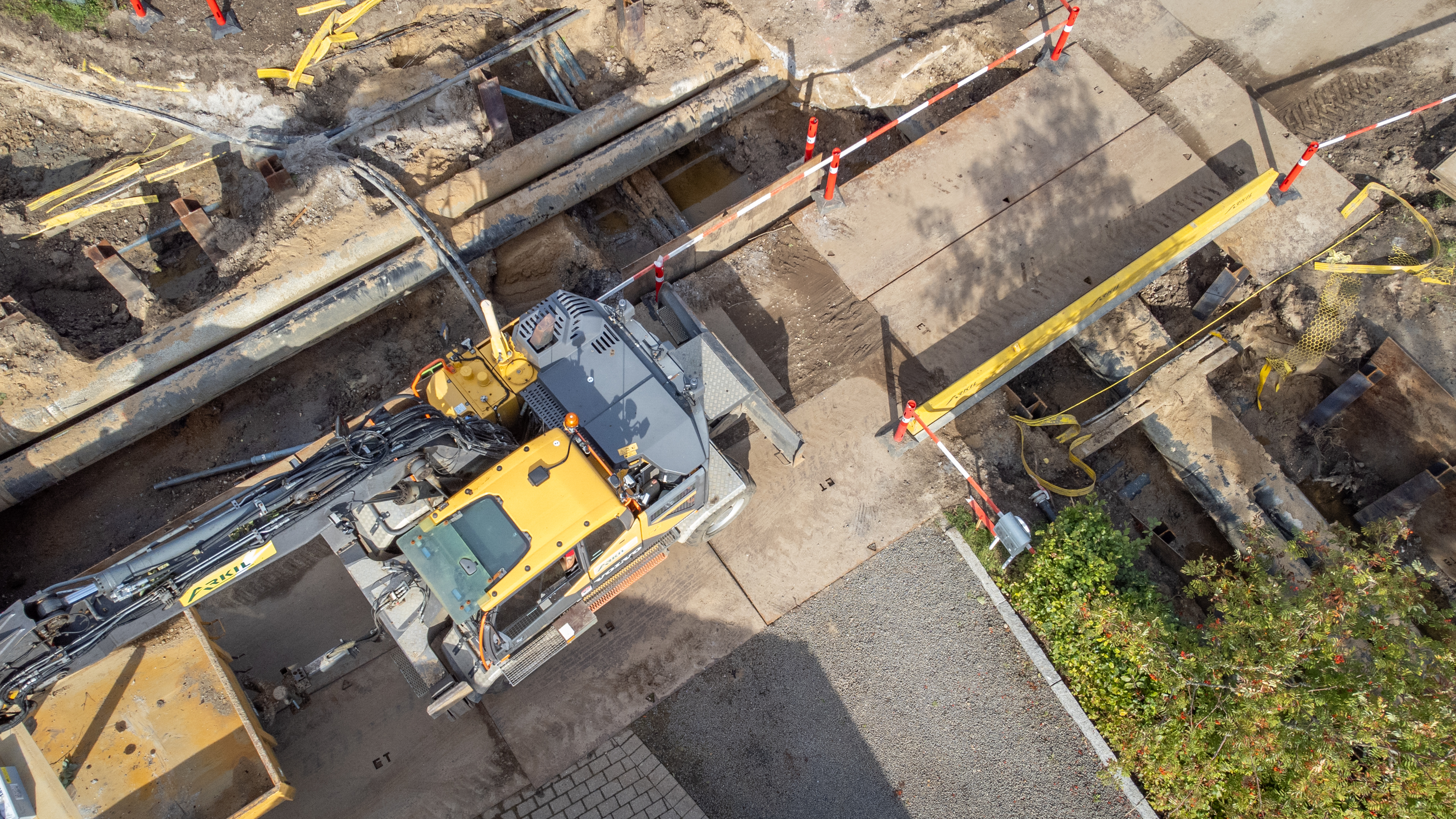 Udfordringerne ligger på kryds og tværs i tracéet, hvor Arkil udskifter gamle fjernvarmerør med nye rør i Ø900 mm. ”Det ka’ vi li’,” siger entrepriseleder.