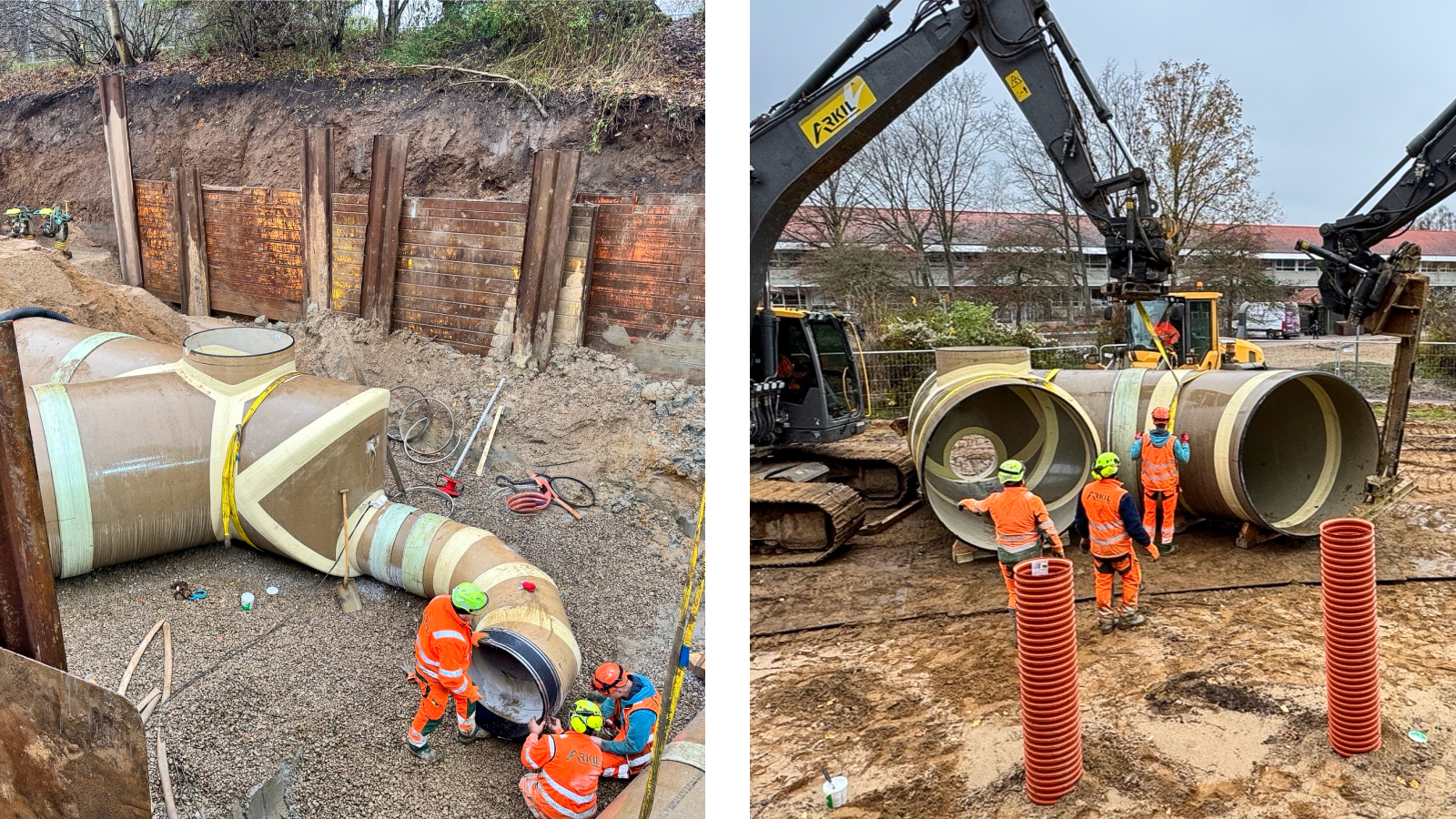 Sjakket er nu færdige med etableringen af de to Ø2000-rør, og arbejder i øjeblikket på at tilslutte de nye rør til det eksisterende ledningsnet. Det er Ø800 glasfiberrør, der forbinder de nye rørbassiner til det allerede etablerede rørsystem.